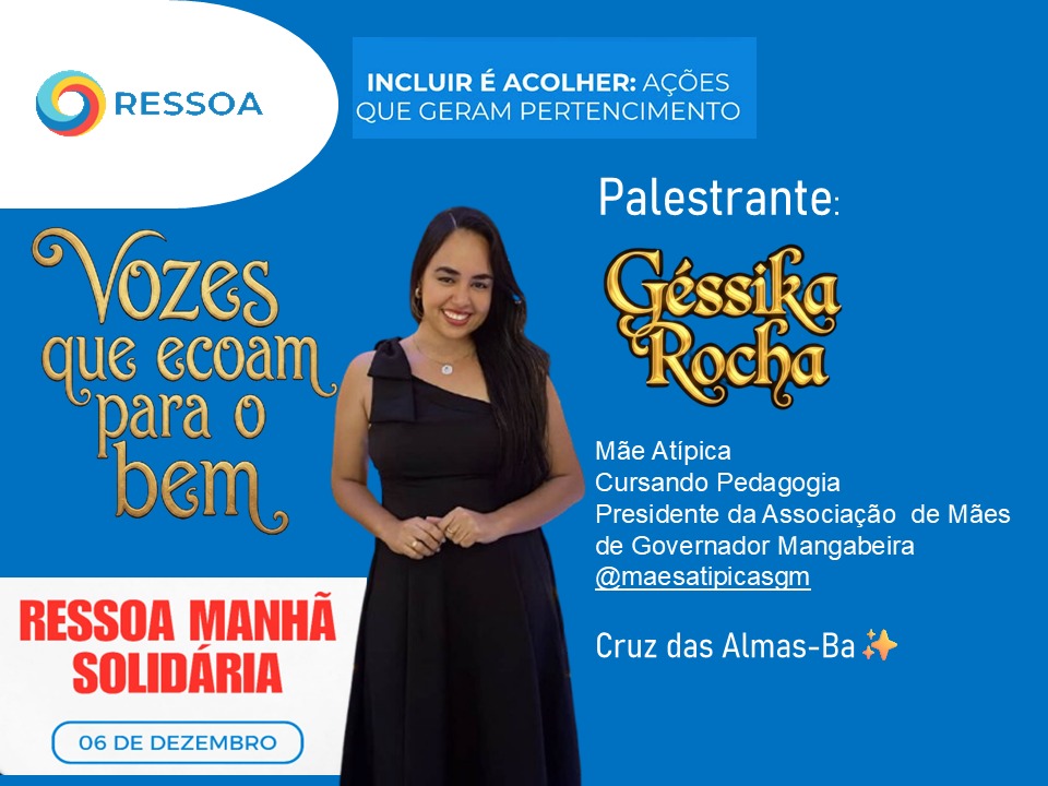 A escritora e mãe atípica Glória Anjos estará presente realizando o lançamento de seu mais novo livro "Maternidade Atípica: Um Relato sobre Amor e Cuidado". Se inscreva para o Ressoa Manhã Solidária, e não perca a chance de acompanhar ao vivo o lançamento deste e de diversos outros livros de escritores que fazem a diferença na inclusão em nossa região.