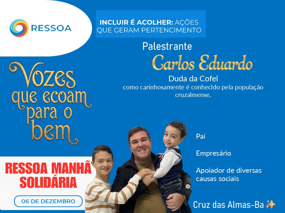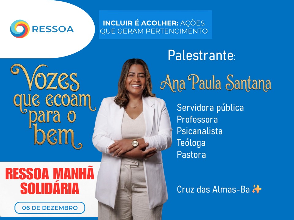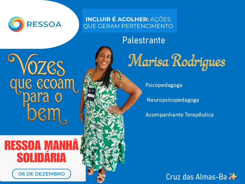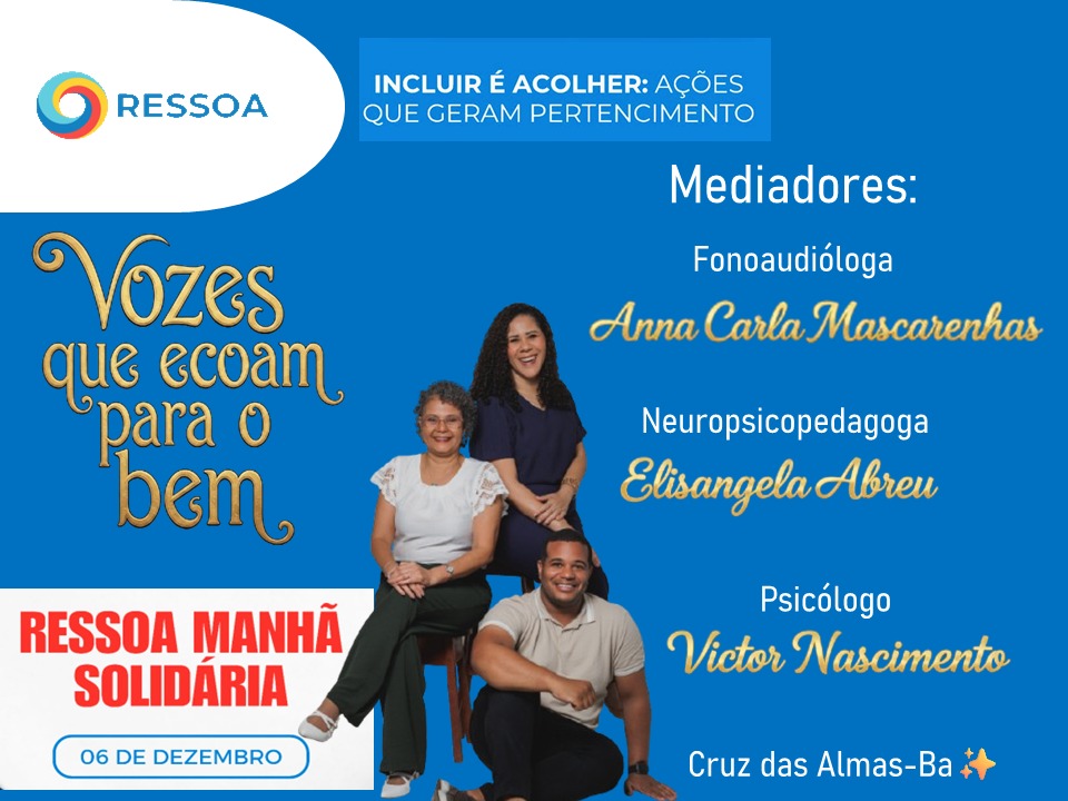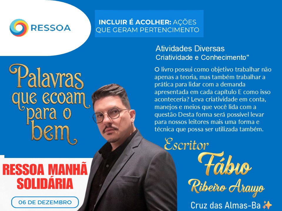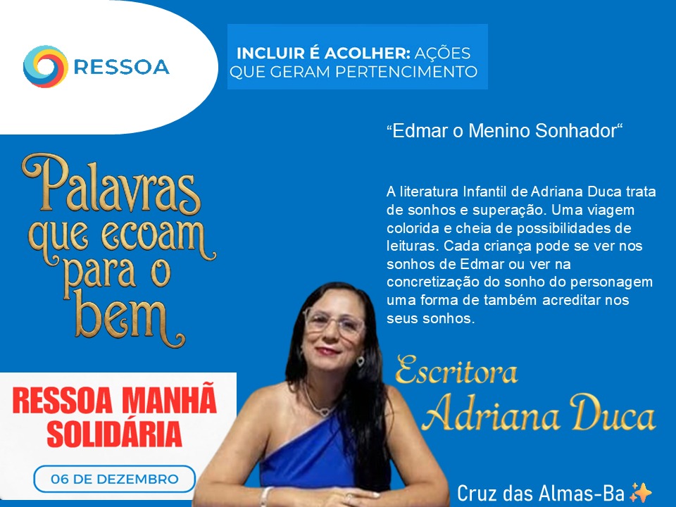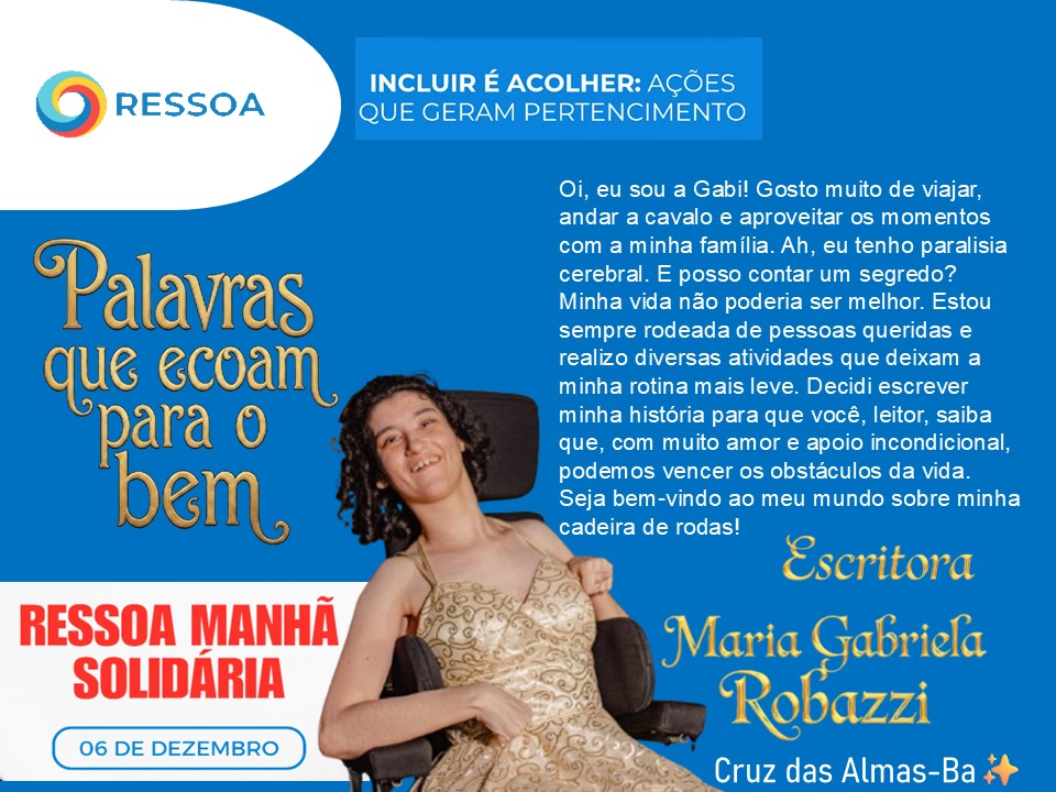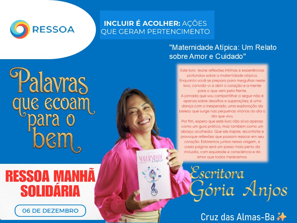 A escritora e mãe atípica Glória Anjos estará presente realizando o lançamento de seu mais novo livro "Maternidade Atípica: Um Relato sobre Amor e Cuidado". Se inscreva para o Ressoa Manhã Solidária, e não perca a chance de acompanhar ao vivo o lançamento deste e de diversos outros livros de escritores que fazem a diferença na inclusão em nossa região.